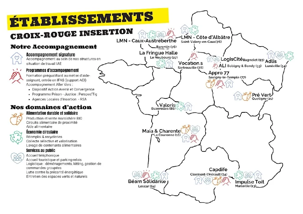 Nos établissements d’insertion sont chacun spécialisés dans des domaines d’action spécifiques pour l’emploi, comme l'alimentation durable, l'économie circulaire et la vente de produits de seconde main, le maraîchage biologique, l’entretien d'espaces verts naturels, la logistique …