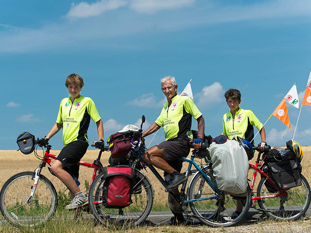Sur la route, difficile de ne pas remarquer cet étrange trio qui avance dans la campagne ardennaise. Juchés sur des vélos pavoisés de fanions de la Croix-Rouge française et de l’association Serge Betsen, Robert, 67 ans, Fabrice, 16 ans, et William, 14 ans, gravissent lentement les dernières côtes qui les séparent de Rethel, petite ville des Ardennes où ils font faire étape ce 23 juillet. Ni le thermomètre, qui affiche un 34 degrés caniculaire, ni le relief ardennais redoutable pour les mollets, ne semblent avoir atteint leur enthousiasme.