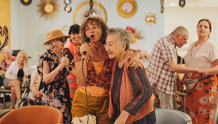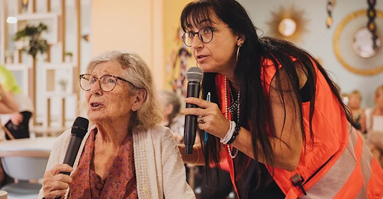 Le repas terminé, on écarte tables et chaises. L’heure est venue de danser et chanter. Deux bénévoles sont aux manettes de la sono et enchaînent les tubes des années 80. Jeanne Mas, Imagination, Les démons de minuit, Gold, David Bowie, Jean-Jacques Goldman… De quoi se trémousser et donner de la voix. « Et puis ça réveille de vieux souvenirs, notamment chez les personnes atteintes d’Alzheimer », précise Claire, assistante soins en gérontologie. Mères et filles chantent en chœur dans le micro, enfants et grands-parents dansent ensemble, puis, inévitablement, une chenille se forme, toutes générations confondues.