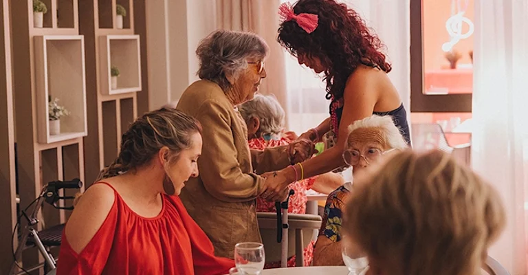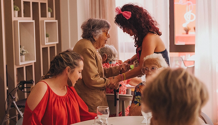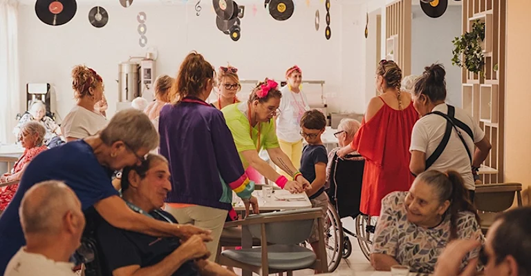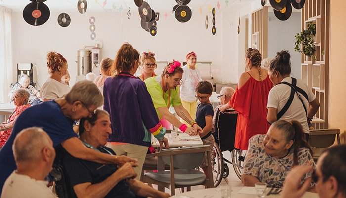 Rubans dans les cheveux, colliers et boucles d’oreilles fluo, t-shirt à l’effigie des Rolling Stones ou à paillettes, guêtres et jupe rose fushia, aides-soignantes, infirmières, psychologue, éducatrice spécialisée jouent le jeu à fond, tout en étant aux petits soins pour les convives. Professionnelles jusqu’au bout des ongles ! Les unes assurent le service, d’autres font la conversation d’une table à l’autre, tandis qu’une équipe prête une attention particulière aux personnes les plus dépendantes. « Une partie des salariés a même pris du temps sur son jour de congé pour être là », déclare avec fierté la directrice.
