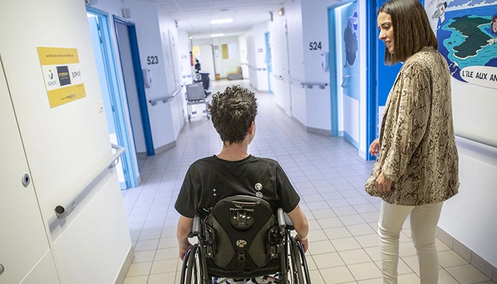 Intégrer le vécu des enfants malades, handicapés, au sein de leur parcours de soin, créer avec eux et pour eux un espace d’écoute et de parole apparaît à bien des égards comme une innovation. Si cette dynamique était déjà bien ancrée dans les pratiques de l’établissement, portée par les équipes médicales, la création d’un poste dédié au partenariat-patient, avec à sa tête Marilyne Peyroche, infirmière de formation et elle-même suivie aux Massues pour ses soins, formalise - et professionnalise - cette volonté. Côté pile, Marilyne a la vision des soignants, la connaissance du métier, de ses attentes et des problèmes systémiques pesant sur l’hôpital et ses praticiens. Côté face, elle est prise en charge depuis sa naissance pour une paralysie cérébrale. Ce double vécu est devenu son métier : celui d’être un pont entre les professionnels, les patients et les aidants. “Il y a des enjeux qui sont parfois différents entre les soignants et les patients : les objectifs médicaux pour l’enfant d’un côté et les objectifs de vie, environnementaux, de l’autre”, analyse-t-elle. Sa mission, en tant que responsable du projet, est de faire en sorte que tout le monde puisse s’exprimer et être entendu. “Ces parcours sont douloureux et difficiles, et s’ils sont juste douloureux et difficiles, c’est insupportable. Mais si on peut rendre ces expériences utiles, faire bouger les choses, alors on arrive à mieux les accepter”, défend-t-elle. Pour permettre aux plus jeunes de s’exprimer, un comité dédié aux enfants a été créé en octobre 2024, avec notamment Raphaël, 13 ans, et Mathilda, 11 ans.