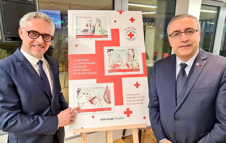 Soutien historique de la Croix-Rouge française, La Poste poursuit son engagement à nos côtés en lançant un nouveau bloc de 3 timbres illustrant l’aide alimentaire, la maraude et la vaccination. Elle reversera deux euros de don à la Croix-Rouge française, pour chaque bloc vendu.