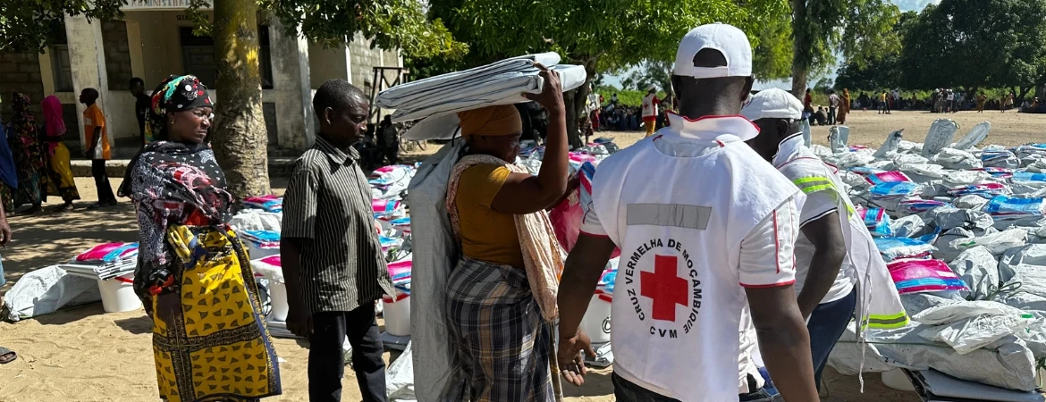 Sous le soleil de juin, les volontaires s’activent. Devant un point de distribution, bâches, moustiquaires, seaux et outils sont soigneusement préparés. Les familles arrivent, certaines patientent en file, d’autres avancent, guidées par les volontaires de la Croix-Rouge du Mozambique. L’organisation est bien rodée. Chaque personne repart avec un lot de biens de première nécessité qui lui permettra de vivre plus dignement, en répondant à ses besoins essentiels : s’abriter, se protéger, cultiver une parcelle ou encore transporter de l’eau au quotidien.