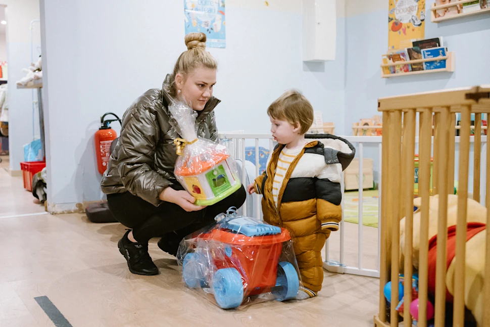 Les familles viennent ici d’abord pour bénéficier de produits pour bébés, souvent très chers dans le commerce. Un colis comprenant du lait maternisé, des petits pots, des céréales, des couches et un produit d'hygiène leur est proposé pour 4 euros - dans le commerce, il en coûterait 37 euros. Ainsi, Angélique* vient deux fois par mois. Il y a un an, la jeune maman ukrainienne a tout quitté : Tcherkassy, sa ville natale bombardée par la guerre, sa famille et ses racines. Dans ses bras, son fils Serafim fêtera bientôt son premier anniversaire. « Je suis toute seule. Je n'ai personne à qui laisser mon fils. J'achète des vêtements, des jouets et du lait ici. Sans cette aide, je ne m'en sortirais pas ». Les parents ont aussi la possibilité d’acheter à petit prix habits, jouets et matériel de puériculture de seconde main. « Les bébés, ça grandit vite ! », s'amuse Maya, une autre maman de 26 ans qui mesure bien sa chance : « Je ne savais pas qu'il y avait tout ça ici. Quand mon fils s'est mis à explorer son environnement, je n'avais pas de jouet... Et là j'en ai acheté cinq déjà emballés pour Noël ! Je n'aurais jamais pu lui offrir ça dehors. ». Au détour d'un sourire, elle se confie sur son parcours. Son Master en droit public, le bouleversement de son arrivée en France, la dureté de son adaptation, sa mère qui lui manque… Grâce à la supervision bienveillante des bénévoles, le lieu est propice aux confidences.