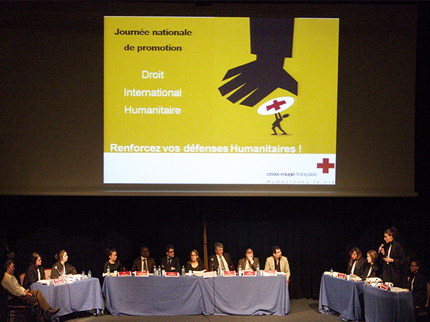 « Promouvoir », « diffuser », « transmettre ». Au sein de l’imposant amphithéâtre Charles Mérieux mis à disposition par l'Ecole Normale Supérieure (ENS) de Lyon, les mêmes mots résonnent. A l’image du sémillant Cyril Perronnet, responsable départemental du pôle d’activité Education humanitaire et Droit international humanitaire, tous les intervenants ont la même motivation : faire connaître le DIH au plus grand nombre, « tant en interne qu’en externe ». Mais au-delà du simple enjeu de cette version lyonnaise du procès simulé, c’est l’objectif patent de l’association qui est mis en lumière. Comme l’explique Antoine Peigney, directeur des relations et des opérations internationales à la Croix-Rouge française, « notre appartenance au Mouvement de la Croix-Rouge et du Croissant-Rouge nous confère des obligations et des responsabilités directement issues des dispositions des Conventions de Genève, à savoir : diffuser le DIH, le faire respecter et contribuer à son développement ».