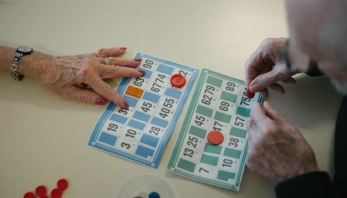 « Premier numéro tiré : le 2 ! », lance l’animatrice au micro. Une bonne vingtaine de résidents participent. Ouverte aux familles, l’activité mensuelle fait carton plein. Il faut tenir la cadence. Chantal et Clélia, bénévole et stagiaire à la Roseraie, aident nos résidents à lire les numéros et à placer les jetons sur les grilles. Quelques-uns sont des compétiteurs. Guy est incollable pour donner le nom des départements associés aux chiffres annoncés. Il est challengé de près par Georges, venu rendre visite à Giselle, sa cousine. Ginette, quant à elle, ne rate jamais un loto : « j’aime jouer et je viens pour l’ambiance. J’ai gagné de belles choses », précise la Poitevine de 77 ans en montrant une jolie montre rose à son poignet. À sa droite, Christine est venue encourager son mari Alain, l’expert loto de notre maison de retraite. Sans surprise, le nonagénaire gagnera deux fois cette après-midi. Il offrira son premier cadeau, un collier, à son épouse, ravie.