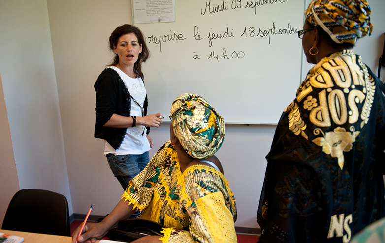 Céline, Sylvie et Magali, toutes trois bénévoles, passent derrière chaque personne pour l’aider. Pour certaines, l'exercice est simple et effectué rapidement. C'est le cas de Nora, qui vient s'inscrire pour la première fois : « j'ai assisté à un cours l'année dernière, ça m'a beaucoup plu alors cette année je saute le pas ». Arrivée du Maroc il y a un an pour rejoindre son mari, elle cherche un emploi et un lieu « où exercer son français et se faire des amies ». Le plus difficile pour elle, c'est d' « être seule toute la journée ». A côté d'elle, Fatma connaît tout le monde. C'est la première à avoir suivi l'atelier il y a dix ans. Ses enfants sont inscrits à un cours d'aide aux devoirs organisés par la Croix-Rouge française. Très motivée, elle instaure naturellement une « dynamique de groupe ». Car plus qu'apprendre à lire et à écrire, cet atelier « est un moyen d'aborder le quotidien des bénéficiaires et de les aider à s'épanouir en étant autonomes », constate la coordinatrice du projet.