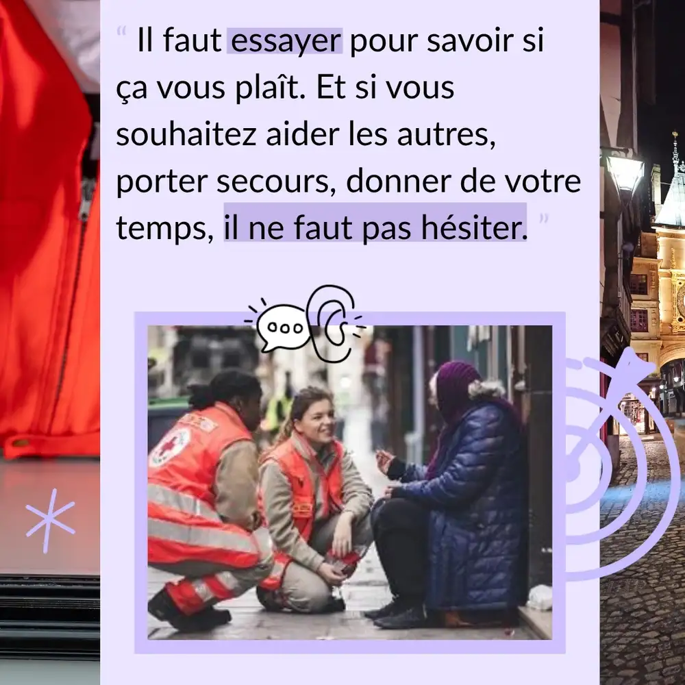 Je conseillerai pour les premières fois de regarder la pluralité des missions que l’on propose pour savoir ce que cette personne souhaite faire. En effet, il y a la distribution alimentaire, l'accès aux savoirs de base, les maraudes, le secourisme et plusieurs autres actions. Il y a beaucoup de choix et cela permet à chaque personne de trouver ce qui lui correspond. Il ne faut pas se dire que l’on n’a pas les compétences, puisque tout le monde peut être bénévole à la Croix-Rouge. Il faut essayer pour savoir si ça vous plaît. Et si vous souhaitez aider les autres, porter secours, donner de votre temps, il ne faut pas hésiter.