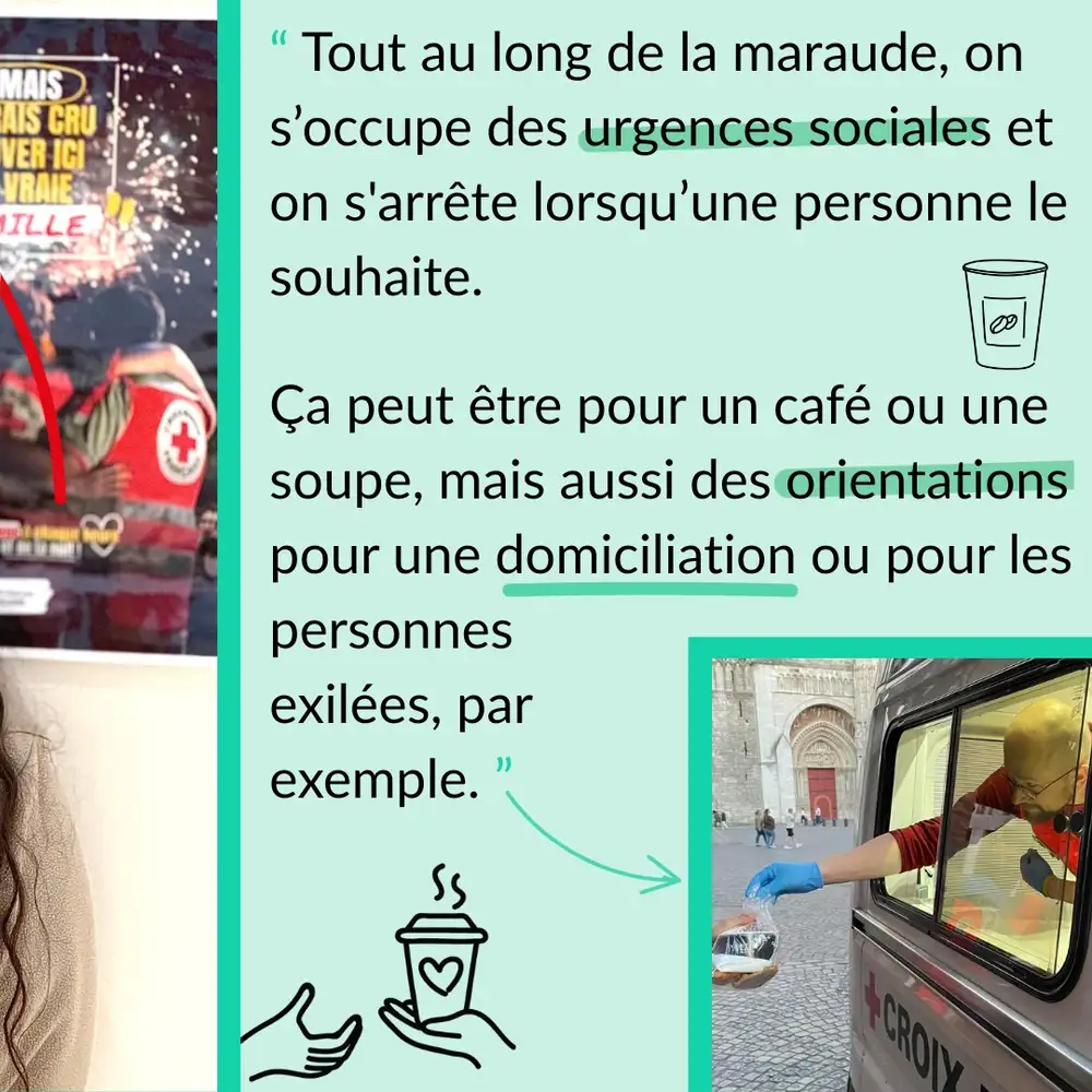 On se rejoint avec les autres bénévoles sur le lieu du local de la Croix-Rouge. Ensuite, on s'occupe de préparer le camion. Il s’agit de regarder s’il nous manque des vêtements d’urgences, des produits d'hygiène, des couvertures, etc. On va s'occuper de faire le café, l'eau chaude et de prendre tout ce dont on a besoin pour le déroulement de la maraude. Ensuite, on part avec le camion. On est en général une équipe de 4 personnes. Puis on va se rendre à notre point fixe à la place du vieux marché. C'est à 20h00 le mardi, le jeudi et le vendredi et à 18h00 le dimanche. On accueille des personnes qui viennent nous voir au camion. On discute, on oriente. Ce sont nos principales missions d'orienter et d'écouter. Par la suite, on va aller marauder dans la ville en fonction de là où sont les personnes et de celles qu’on croise sur notre chemin. On est aussi en lien avec le 115. Ils peuvent nous appeler au cours de la soirée s’il y a des urgences. On peut être amené à faire des transports de personnes vers des foyers d’hébergement, par exemple. Tout au long de la maraude, on s’occupe des urgences sociales et on s'arrête lorsqu’une personne le souhaite. Ça peut être pour un café ou une soupe, mais aussi des orientations pour une domiciliation ou pour les personnes exilées, par exemple. On finit la maraude vers 00h00 et on rentre au local pour ranger notre camion et préparer ce qu’il faut pour la prochaine maraude.