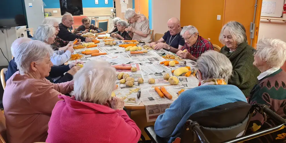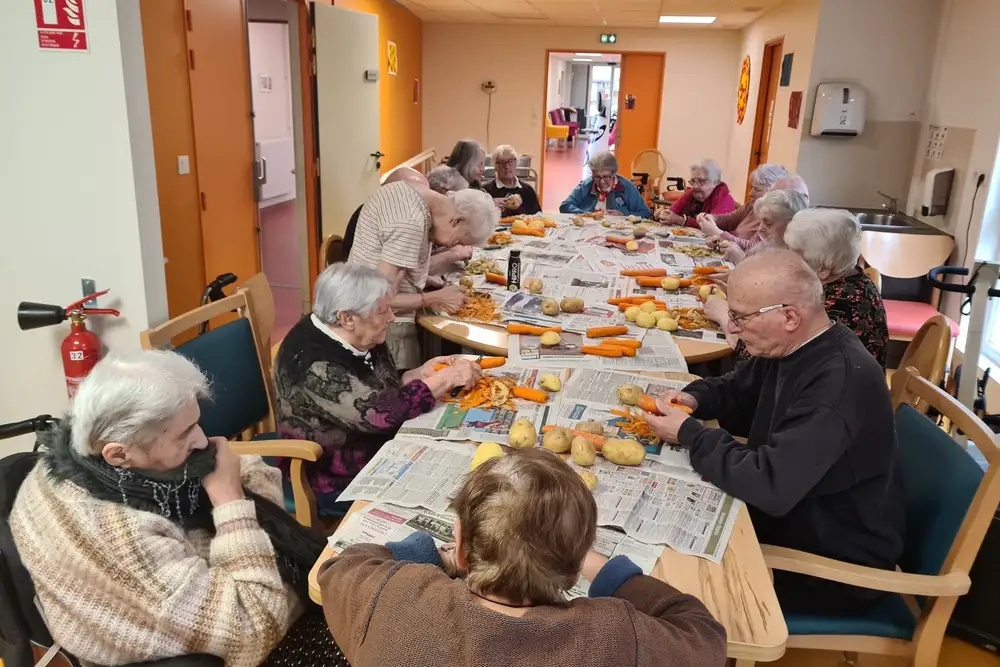 Mardi matin, nos résidents ont mis la main à la pâte pour l'atelier pluche, un moment toujours très apprécié où ils peuvent donner un coup de main aux cuisiniers. Une belle occasion de participer à la préparation des repas tout en passant un bon moment ensemble ! Et comme toujours, nous avons terminé en beauté avec notre traditionnel petit apéro. Merci à nos cuistots pour ce délicieux repas !