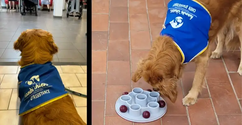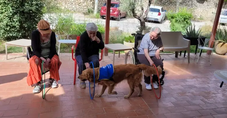 À l'EHPAD Saint Joseph, les journées de nos résidents se sont illuminées grâce à une nouvelle présence aussi adorable qu'utile : Tennessee, une chienne d’accompagnement social formée par l'association Handi'chiens. Arrivée récemment chez nous, Tennessee a déjà conquis le cœur de tous par sa douceur et son dévouement. Cette magnifique golden retriever rousse, a été spécialement formée pour apporter soutien et réconfort aux personnes âgées.