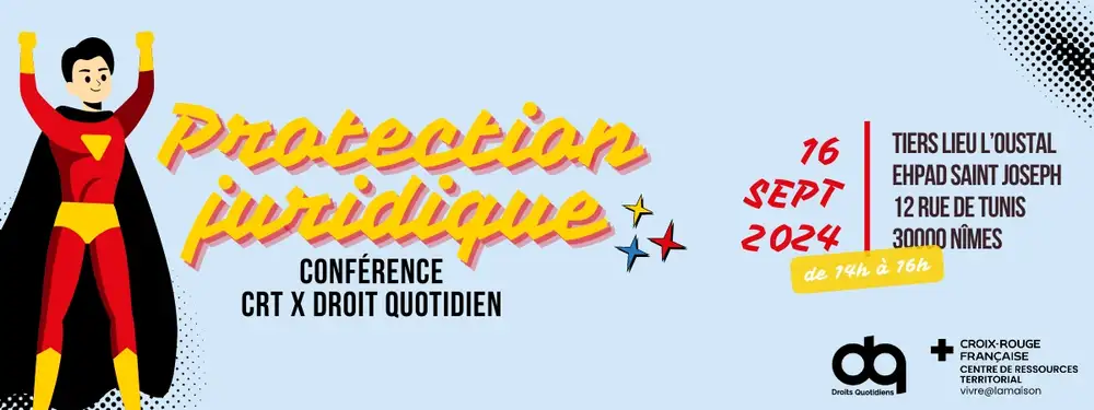 Nous avons le plaisir de vous inviter à une conférence sur le thème de la protection juridique et du mandat de protection futur, organisée par le Centre de Ressources Territorial Vivre@lamaison en collaboration avec Droits Quotidiens Legal Tech . Cette conférence se tiendra le lundi 16 septembre à 14h dans la salle du Tiers Lieu de l'EHPAD St Joseph, située du 12 rue de Tunis, 30000 Nîmes.