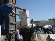 Xavier, envoyé par la Croix-Rouge française, est chargé de rester près des camions pour surveiller que chacune des personnes présentant un ticket reçoit bien tous les articles : bâches en plastique, couvertures, kits hygiène, ustensiles de cuisine, seaux… « Contrairement à d’autres, comme les militaires, nous ne sommes pas armés pour faire nos distributions. Nous travaillons en amont avec la Croix-Rouge haïtienne et les comités locaux qui se sont organisés dans les camps afin qu’ils nous aident à assurer le bon déroulement des distributions. La sensibilisation est la meilleure sécurité», explique Xavier.