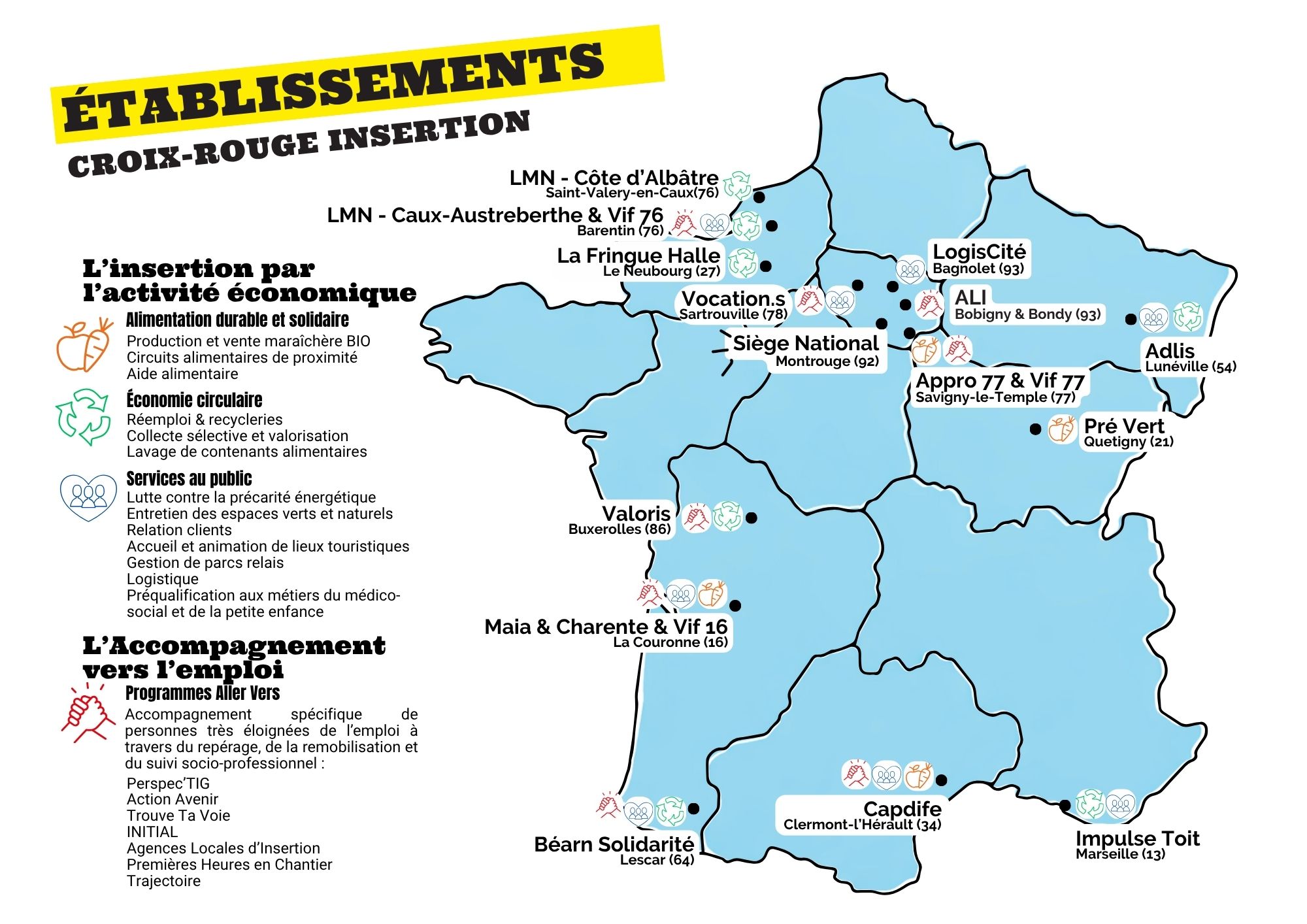 Croix-Rouge insertion est une filiale de la Croix-Rouge française créée en 2011 pour faire du développement de l’emploi dans les territoires un axe majeur de la lutte contre la précarité. Croix-Rouge insertion est ancrée dans l’économie sociale et solidaire avec un réseau de structures locales sur toute la France : logistique, vente en ligne, recycleries, maraîchage, centre d’appels, accueil touristique, métiers du soin… c’est une équipe de 170 salariés permanents et plus de 2 979 personnes accompagnées en 2025 qui travaillent chaque jour pour une économie plus inclusive, durable et solidaire.