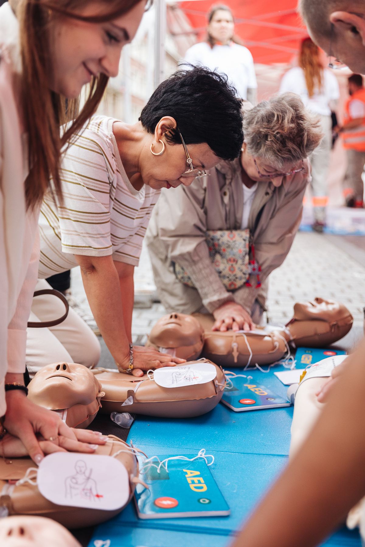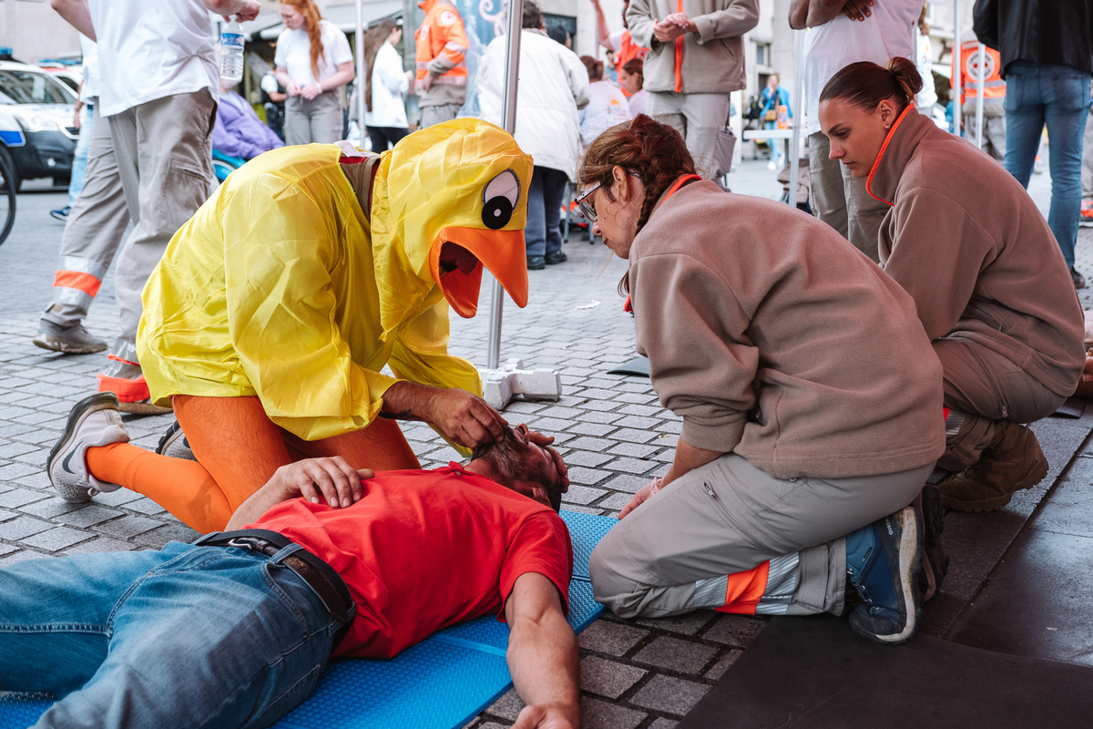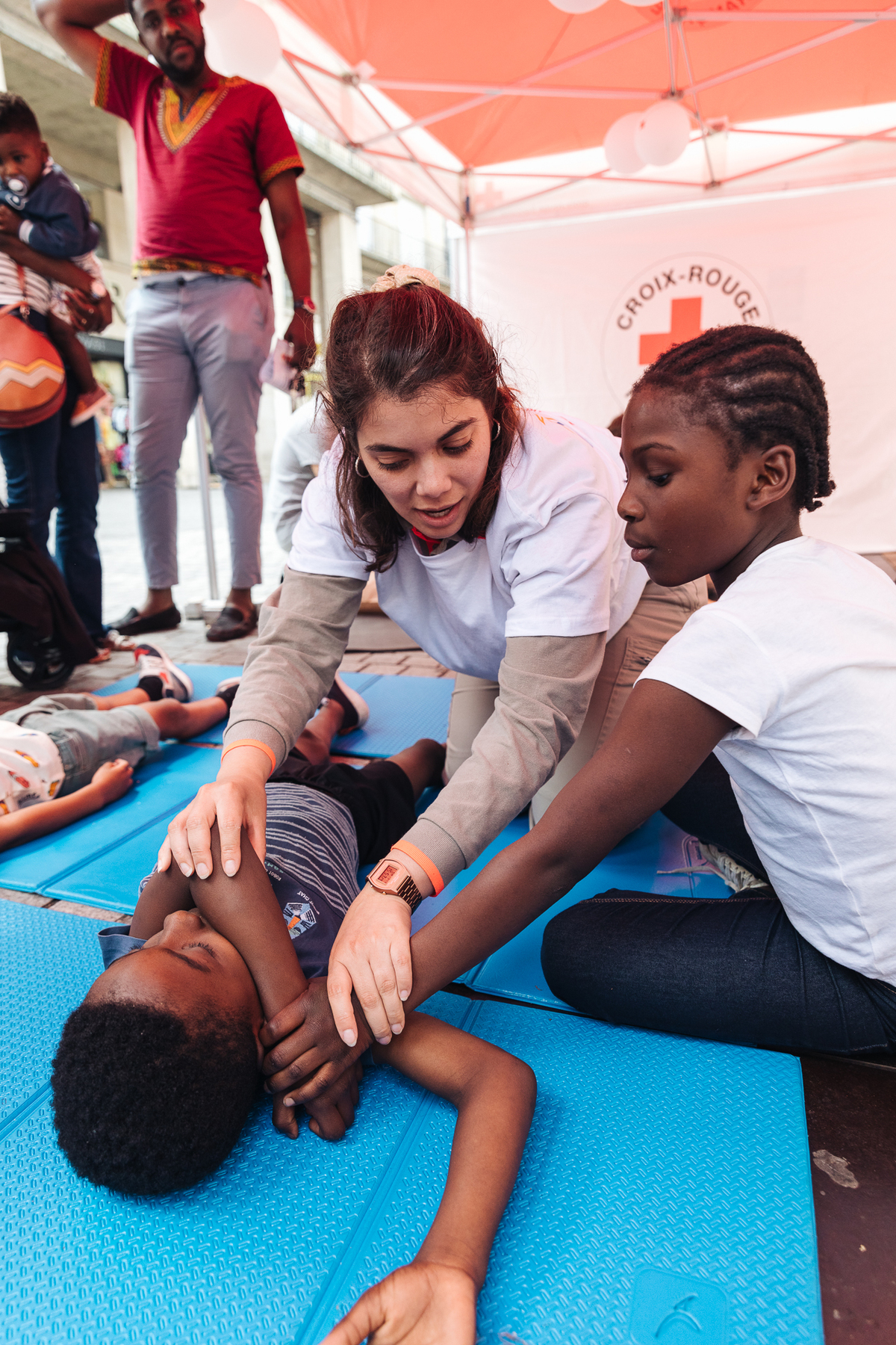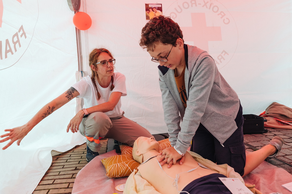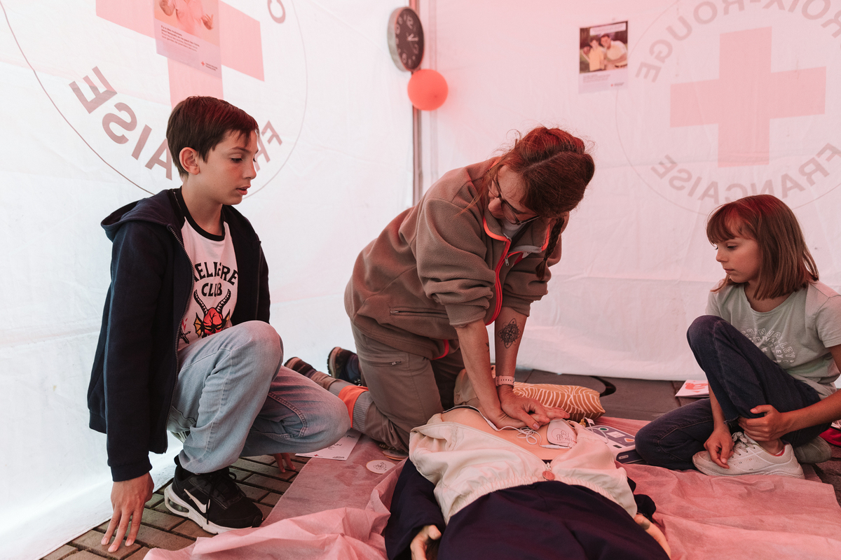 « Bonjour madame, Nous sommes de la Croix-Rouge ! Nous organisons une initiation aux premiers secours, place Gambetta. Si vous voulez passer, c’est toute la journée ! ». En t-shirt à manches courtes alors qu’une fine pluie commence à tomber, d’un pas assuré, Mathilde déambule dans le centre-ville d’Amiens. La veille encore, elle passait les épreuves du Bac français. A ses côtés, Maxime, de soixante ans son aîné, distribue un flyer sur lequel un programme d’ateliers est annoncé : escape games, initiations aux premiers secours, au massage cardiaque et aux accidents de la vie courante. « C’est pour quoi ça, papa ? », interroge un petit garçon. « C’est pour apprendre à sauver des vies », répond son père. Place Gambetta, une vingtaine de bénévoles peaufinent l’installation, lorsque les premiers passants se présentent. Bruno les accueille. Cinq ans après son entrée à la Croix-Rouge, ce jeune retraité, ancien plombier, est désormais le principal formateur PSC1* de la délégation. « Il adore ça », glisse Eugénie Evrard, directrice territoriale adjointe de l’urgence et du secourisme. Et ça se voit.