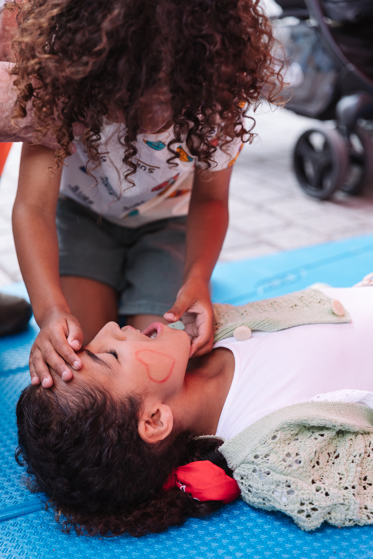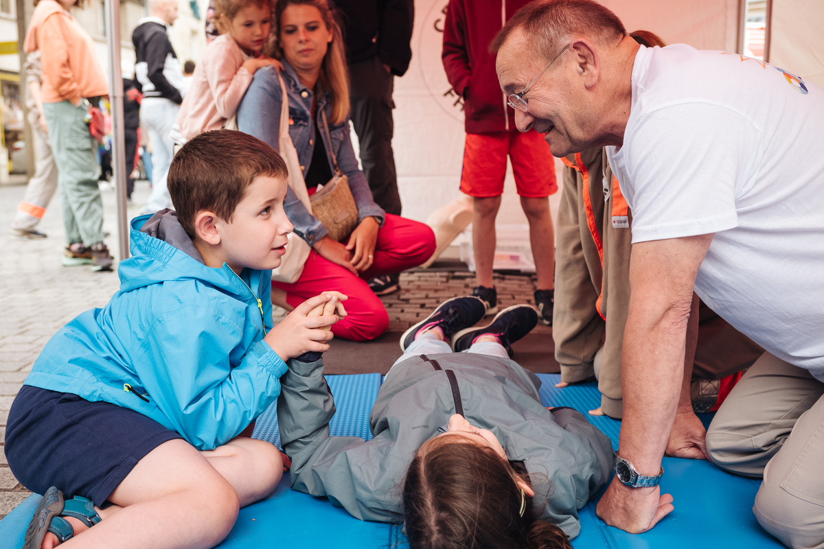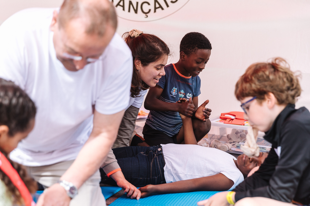 A l’extérieur, Bruno a changé de public. En face de lui, Paul et Mia, 6 et 10 ans, suivent attentivement ses explications. Un petit attroupement s’est formé autour d’eux. Il leur montre des panneaux plastifiés où sont dessinés des personnages dans des contextes dangereux. Ses deux élèves, venus d’Allemagne, semblent déjà bien informés. Et pour cause, leur grand-mère, Pétra, chez qui ils sont en vacances, était bénévole à la Croix-Rouge en Allemagne avant de s’installer à Amiens où, avec son mari, elle a rejoint la délégation de la Somme. Les enfants sont donc à bonne école. Pour Bruno, souvent seul pour assurer les formations PSC1, ce type d’évènement est l’occasion de s’adresser à tous les âges et de varier les formats de sensibilisation en compagnie des autres initiateurs et formateurs. Voire de se retrouver dans des situations cocasses : un futur marié, déguisé en poussin pour fêter son enterrement de vie de garçon, a profité de passer par là pour se remettre en tête les bons gestes.