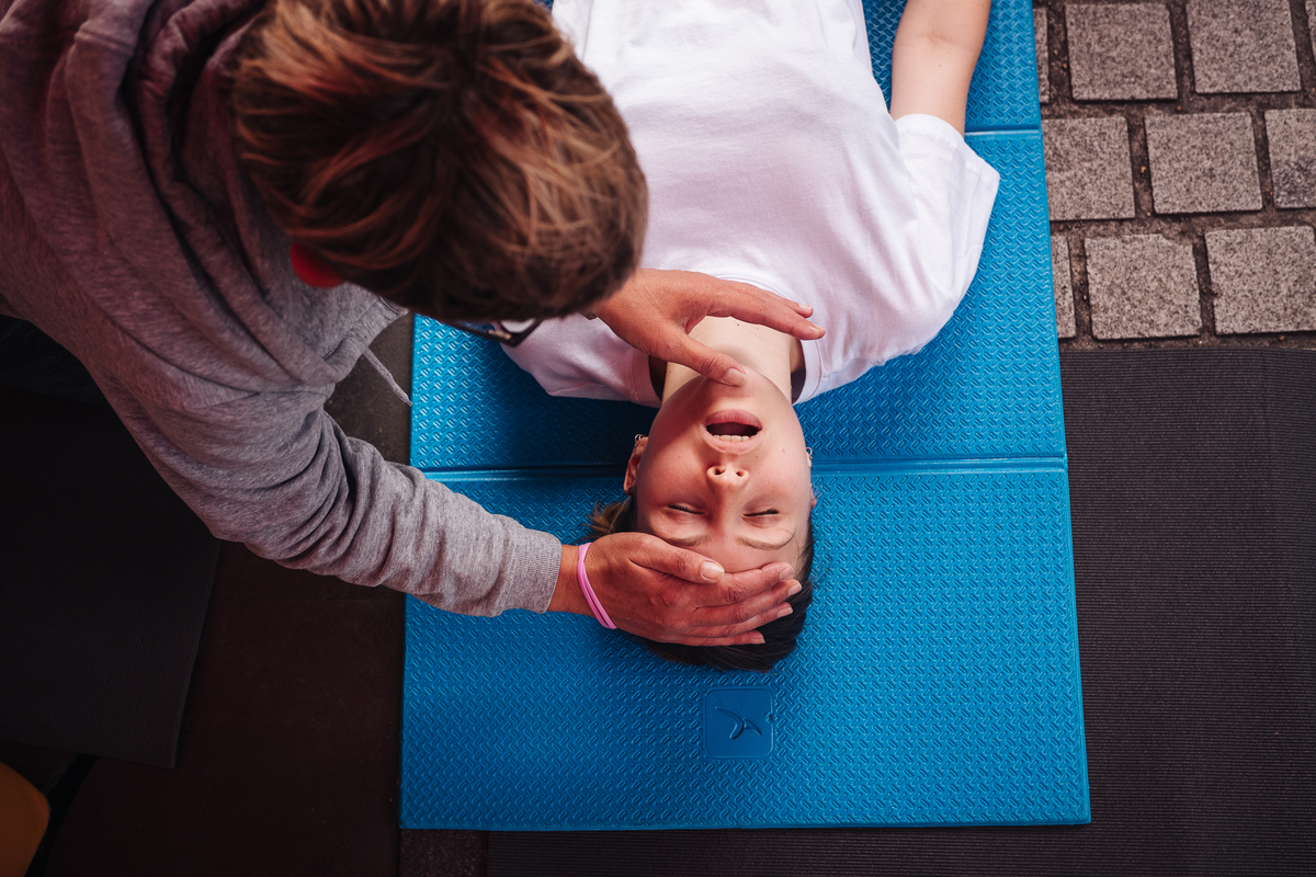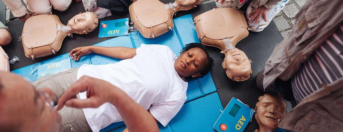 « Imaginez que vous trouvez cette personne inconsciente, un fil électrique à la main. Une autre personne s’apprête à la toucher. Que feriez-vous ? », demande Bruno, accroupi sur un tapis de sol, face à un groupe particulièrement concentré. « Il ne faut pas la toucher », répond Charlotte. « Il faut couper le courant », ajoute Jennifer. « Voilà, reprend Bruno. Il faut analyser la situation. S’il y a un danger pour soi, on ne peut pas sauver des victimes ». Le formateur ne manque pas d’imagination. Cette fois, la personne inconsciente, jouée par Fatoumata, une autre bénévole, est allongée sur des voies ferrées. « Je vous rappelle qu’il faut 2 kms à un train pour s’arrêter. Que faites-vous de cette personne, alors ? ». « On l’allonge entre les rails », suggère Armel. « Passer sous un train, même entre les rails, je pense que ce n’est pas une bonne chose », s’exclame Bruno, déclenchant les rires de ses apprentis. « Il faut la sortir mais si elle a un traumatisme, c’est risqué, non ? », s’inquiète Charlotte. « Certes, mais une chose est sûre : si le train lui passe dessus, on ne pourra plus la sauver. Donc, il faut faire un déplacement d’urgence. On tient par les pieds ou les bras et on tire ». Par la suite, la petite équipe apprendra à contrôler si la victime respire ou pas, à la mettre en position latérale de sécurité (PLS) ou, après un petit rappel sur les différents numéros d’urgence, à lui faire un massage cardiaque. « La fréquence du massage est de 100 à 120 battements par minute. Pensez à la chanson « Stayin alive», c’est le bon tempo, précise Bruno, l’air malicieux.