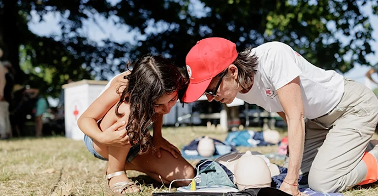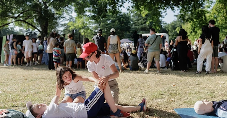 Le Festival Play bat son plein ce premier samedi de juillet au parc de l’Ermitage de Gradignan. Plus de 4 000 visiteurs sont attendus. Un événement qu’Alexandre a énormément préparé en amont et pour lequel il s’est démené ! Laëtitia, bénévole de la Croix-Rouge à Gradignan ne perd pas une minute : « Allez, on y va, on installe tout ! ». Elle motive les troupes avant le début du concert qui clôturera la journée. Et ce ne sont pas les 31 degrés qui vont démotiver nos six volontaires présents, venus spécialement pour sensibiliser le grand public aux gestes qui sauvent : position latérale de sécurité, massage cardiaque, pose de défibrillateur et désobstruction des voies aériennes. L’objectif est vital : informer, former et préparer les citoyens aux accidents de la vie, afin que le plus grand nombre soit en mesure d’agir sur sa sécurité et celle des autres.