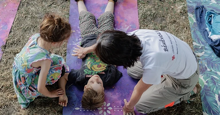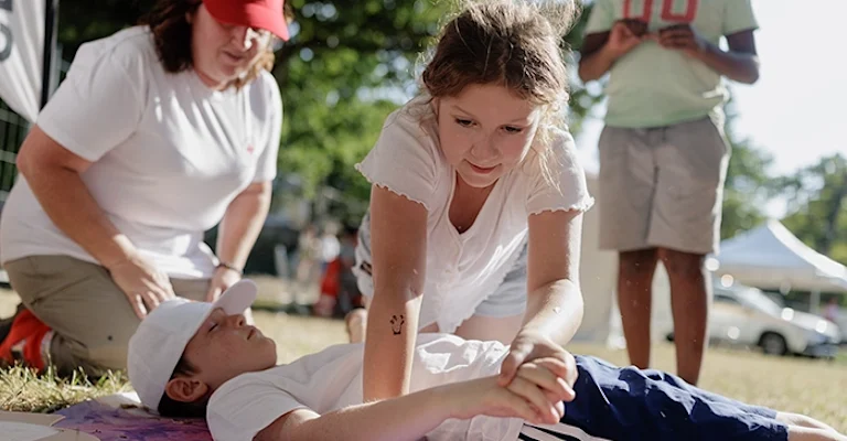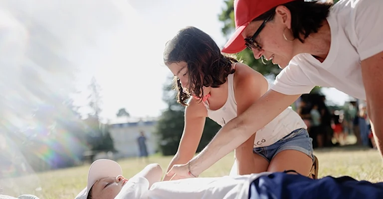 Tandis que Samuel dépose six mannequins adultes, enfants et nourrissons sur l’herbe et vérifie le bon fonctionnement du matériel, Richard accueille les premiers inscrits. Jad, 11 ans, et son petit frère Taha sont impatients de commencer le massage cardiaque : « On a déjà vu ça dans les films ! ». Le formateur remet gentiment les choses à leur place, déconstruit les a priori, avec bienveillance : « En réalité, ce n’est pas la même chose. On doit s’assurer que la victime est sur un sol plat et dur et la poitrine dénudée. Ensuite, on met les mains au creux du sternum. Je te montre et après, tu vas le faire ». Leur maman Océane, ancienne ambulancière, écoute les consignes d’une oreille attentive : « C’est la première fois qu’on fait un atelier en pleine nature. C’est très convivial ! ».