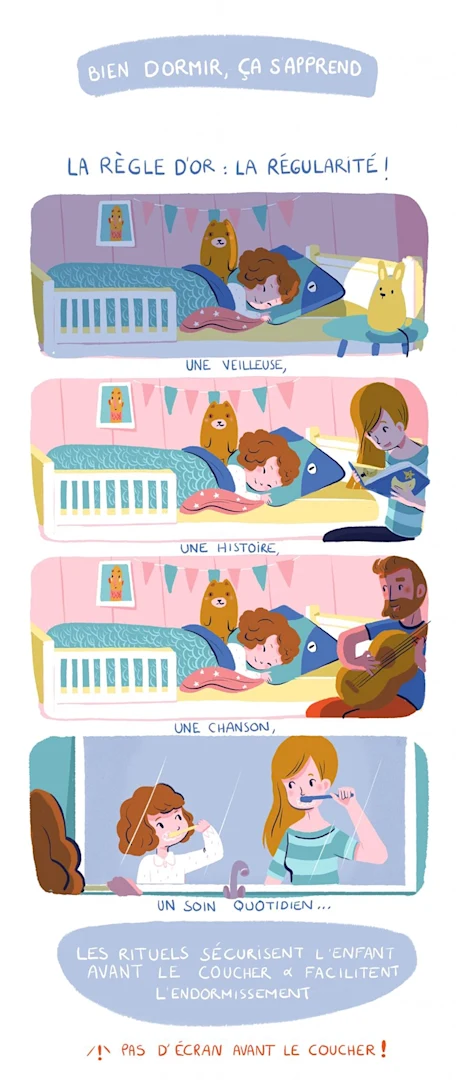 Chaque parent va mettre en place un rituel d’endormissement adapté à ses habitudes de vie. Il n’y a pas de recette miracle !