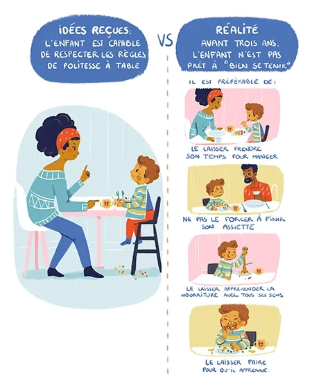 Le plus gros frein à la familiarisation avec la nourriture est l’adulte. Il est certain que voir l’enfant se salir et jouer avec sa nourriture bouleverse nos schémas habituels de politesse et de tenue à table. Aussi, on a peur qu’il s’étouffe, soit impoli face à des invités ou salisse ses vêtements. Ces codes sont les nôtres, eux ne peuvent pas encore les comprendre ! Il est alors important de l’accompagner et de le soutenir afin qu’il se sente en confiance et ait envie d’apprendre la bonne tenue à table. Pour ce faire, on peut par exemple le vêtir d’habits spécifiques au temps du repas.