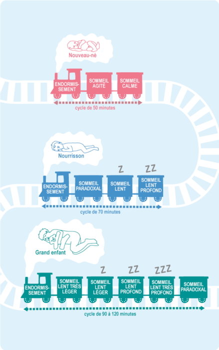 Chez le nouveau-né, un cycle complet dure 50 minutes comprenant l’endormissement, le sommeil agité et le sommeil calme.