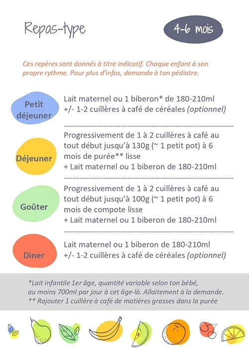 Environ 15 jours après l’introduction des légumes, vous pourrez intégrer les fruits au moment du goûter, en plus du biberon de lait ou de la tétée. Tout comme les légumes, vous pouvez commencer par quelques cuillères, un fruit après l’autre. Ils peuvent être sous forme de compote ou proposés bien mûrs. Au bout de plusieurs jours voire semaines, il sera capable de manger un petit pot de 130 grammes environ.