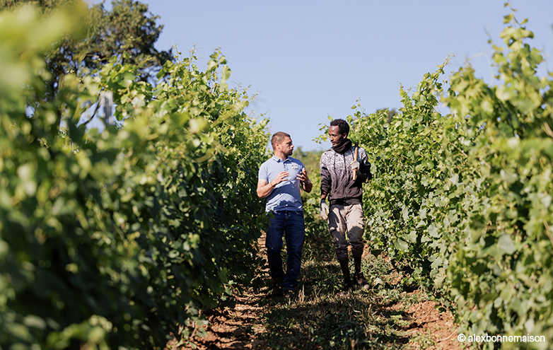 Dans les vignes ce matin-là, la pertinence du projet ne fait aucun doute. Rang après rang, l’équipe s’occupe des pieds de vigne avec précision et souci du détail. Entre deux petits coups de pioche, Johan montre à Tomas et Daoud les impacts de la grêle sur les grains de raisin, les grillures du soleil, la façon de prendre soin du bois pour préparer la récolte de l’année suivante. « A l’issue du contrat pro, nous souhaitons leur proposer un CDI, souligne Alexandre Dos Santos, directeur des domaines au sein de la Maison Boisset. Nous avons besoin de personnes motivées, intéressées, volontaires. Donc si ça leur plaît, bien sûr qu’ils seront invités à rester. Par leur trajectoire de vie, ils suscitent le respect. Et quand on connaît un peu leur histoire, ça fait relativiser les petits problèmes de chacun. Au sein de l’équipe, on se dit qu’on s’en sort pas si mal, finalement. »