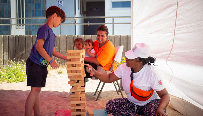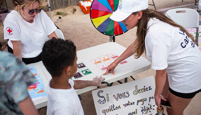 Pour aller plus loin, les bénévoles proposent toute une série de jeux sur les thématiques migratoires : Jenga, Memory de l’exil, cocottes en papier, roue des questions, casque de réalité virtuelle ou encore jeu de cartes de l’équipe olympique des réfugiés. « À travers ce jeu, nous ouvrons la discussion sur ce que l’équipe des réfugiés représente, le contexte de leur pays d’origine et l'impact du sport pour les personnes migrantes », affirme Gaëlle, bénévole à la Croix-Rouge depuis 4 ans. Le principe est simple : associer des cartes athlètes à des cartes sport. Bertrand et Théo, sont intrigués. « On ne connaissait pas du tout cette équipe olympique, c’est génial de découvrir le parcours de chaque athlète ! On apprend plein de choses et on repart avec une vision profondément transformée ».