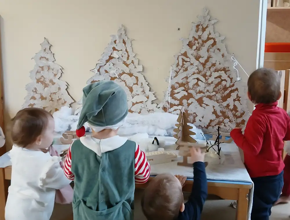 Nous fêtons l'hiver et la fin de l'année dans la section des petits avec une œuvre collective parents-enfants, un atelier sensoriel et la salle de vie se transforme en bleu et blanc pour la journée!