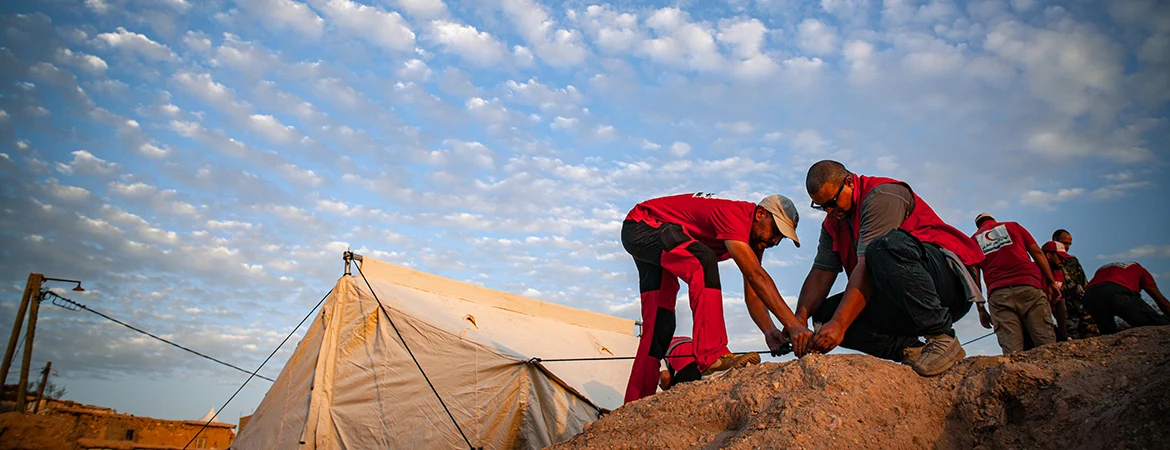 En septembre 2023, un séisme de magnitude 6,8 a touché le Maroc, au sud-ouest de Marrakech. Environ 320 000 personnes ont été exposées dans le massif de l’Atlas. Près de 60 000 habitations ont été endommagées, dont un tiers complètement détruites. Le gouvernement Marocain s’est fortement impliqué dans la gestion de la crise. Dès les premières heures, le Croissant Rouge Marocain a mobilisé des équipes de réponse d’urgence pour délivrer des soins de premiers secours et distribuer des équipements.
