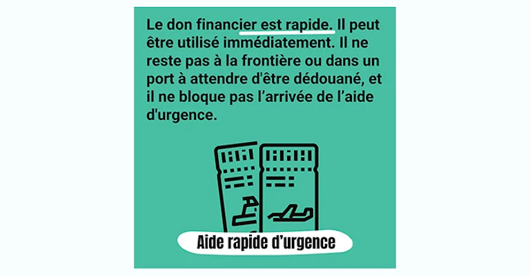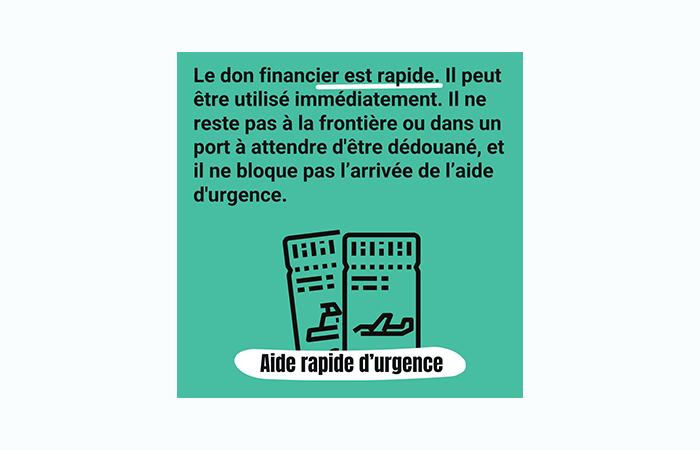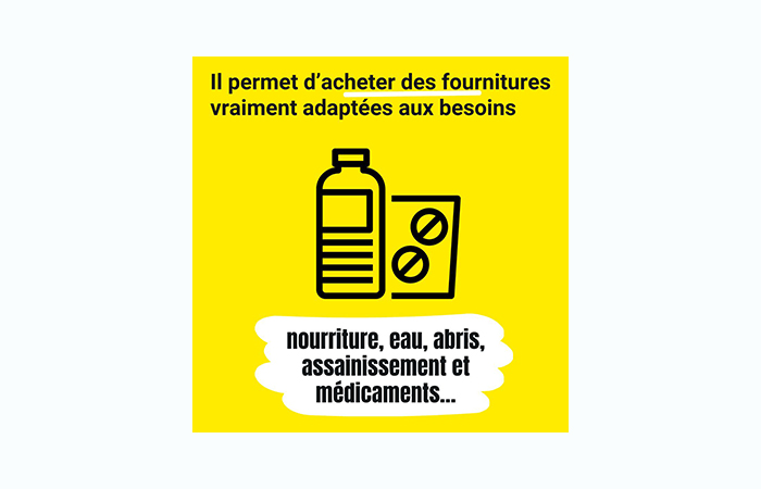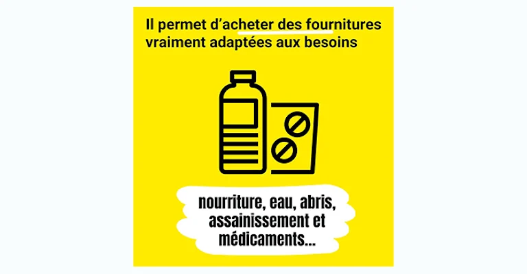 L’aide financière permet d’acheter des articles de première nécessité homogènes, en gros et à prix plus bas. Elle permet d’obtenir des fournitures vraiment adaptées aux besoins qui sont remontés directement par nos contacts sur le terrain - de la nourriture, de l’eau, des tentes, des couvertures, des abris, du kérosène, des pompes à eau, des groupes électrogènes et des médicaments… mais aussi des citernes, des stations de traitement d’eau, des kits d’assainissement de l’eau car la potabilité est souvent au cœur des problématiques en cas de crise.