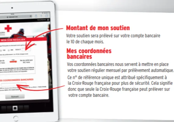 Nos équipes proposent aux personnes rencontrées dans la rue ou à leur domicile de devenir donateur régulier. Celles qui le souhaitent s’engageront à faire un don mensuel par prélèvement automatique. Elles rempliront un bulletin de soutien (papier ou numérique par l’intermédiaire d’une tablette tactile) et donneront leurs coordonnées bancaires (RIB/IBAN) afin de mettre en place le prélèvement automatique.