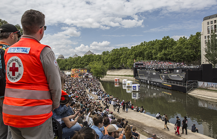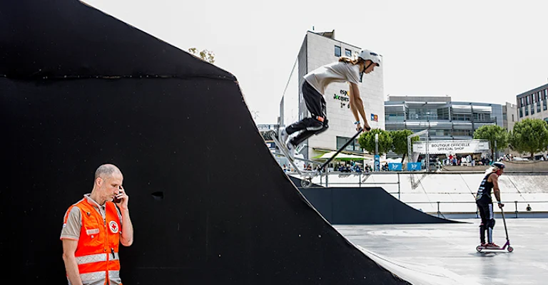 « Le truc de fou avec le FISE, c’est que, vu les prouesses techniques des athlètes engagés, on n’a surtout pas envie que les gars - et les filles - se fassent mal… et qu’en même temps on rêve d’intervenir. L’adrénaline de l’événement déteint sans doute un peu sur nous ! », observe Athénaïs, 18 ans, depuis la rive opposée. Soudain, la radio de Sofiane, son chef d’équipe, grésille –appel du PC (le poste de commandement). Les quatre compères de l’équipe mobile entament une course de 800 mètres au milieu de la foule, dense. Skate à la main et casquette vissée sur le crâne, un enfant a chuté entre deux barrières. Sa mère est inquiète. Le bilan est rassurant - plus de peur que de mal finalement. Un coup de spray désinfectant et un pansement plus tard, le petit gars peut repartir admirer ses idoles.
