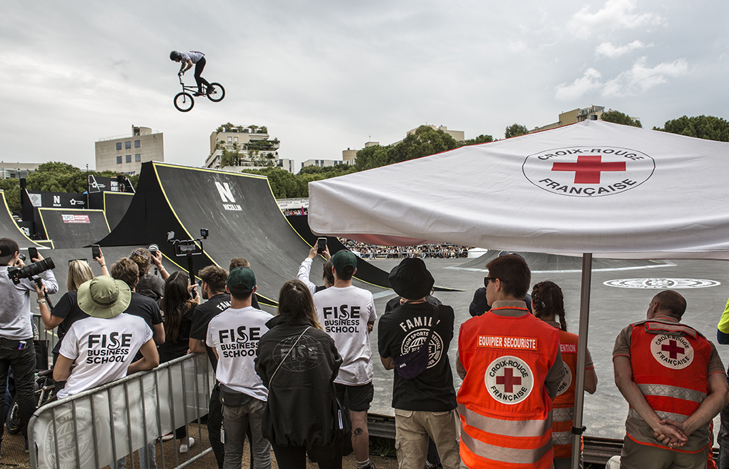Guillem lui, file avec son équipe prendre place au pied des rampes de BMX. Le poste est l’un des plus impressionnants du dispositif, les riders s’envolant parfois à plus de six mètres dans les airs… Le risque de chute y est donc maximum.