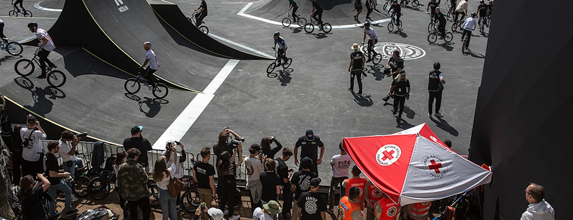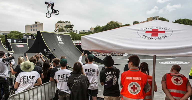 Elles ont le regard encore timide, presque furtif, alors qu’autour d’elles, ça s’agite, ça rigole, ça papote. En attendant le brief à venir, "les collègues", un café à la main, prennent des nouvelles des uns et des autres, avant de se raconter « leurs interventions » de la veille sur le FISE - le Festival international des sports extrêmes de Montpellier. Le 4e jour de l’événement pointe en effet le bout de son nez. En ce samedi, plus de 100 000 spectateurs sont attendus, venus admirer les prouesses de quelque 1 800 riders de tous pays. BMX free style, flatland, breaking, parkour, roller, skate ou trottinette… Si le nom de certaines de ces disciplines a de quoi déconcerter le néophyte en sports urbains, la plupart des montpelliérains les connaissent sur le bout des doigts, eux qui accueillent depuis des années le rassemblement, synonyme d’étape de coupe du monde pour nombre des sportifs présents. Et nos bénévoles secouristes ne sont pas en reste, eux qui assurent depuis près de dix ans le dispositif prévisionnel de secours (DPS) mis en place pour l’occasion.