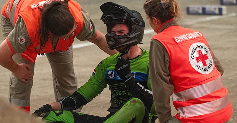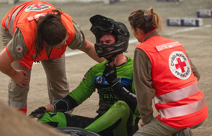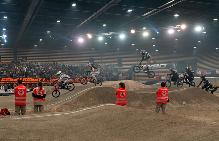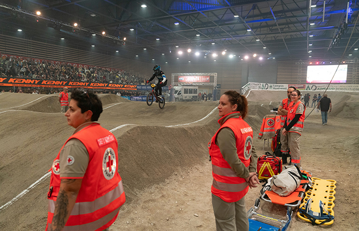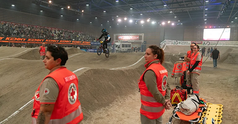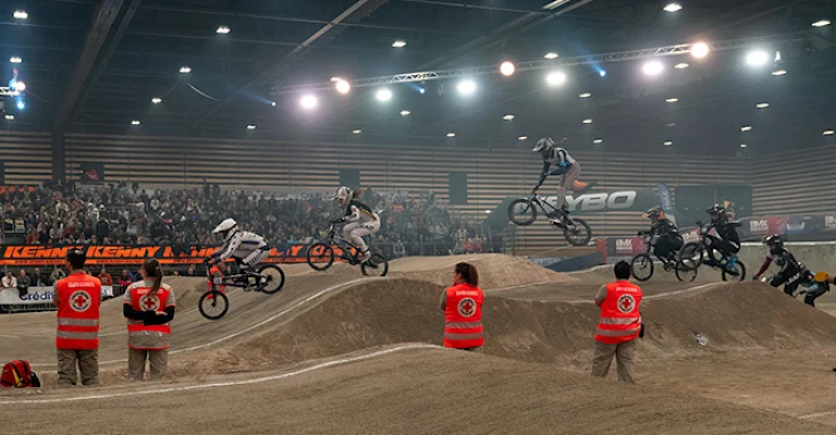 Guillaume, Lou, Mélanie et l’équipe de secouristes de la Loire sont des habitués du BMX Indoor, cela fait des années que les organisateurs leur font confiance. Chaque édition, les meilleurs pilotes de BMX français et internationaux se retrouvent pour s’affronter durant 3 jours. Cette compétition présente une particularité : on y joue les qualifications pour les Jeux Olympiques. Une sacrée raison pour prendre des risques… et tester la réactivité de notre équipe !