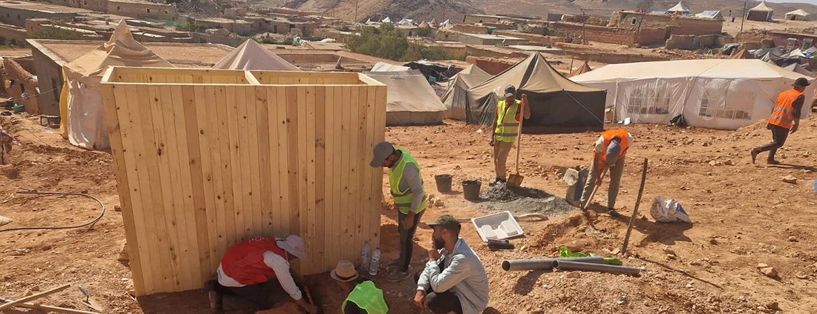 Nos 4 volontaires, soutenus par une déléguée de la Croix-Rouge espagnole chargée de la promotion à l’hygiène, sont actuellement à pied d’œuvre à Tagadirt Adassil. C’est l’un des nombreux petits villages (douars) à avoir été en partie détruit par le séisme, début septembre. Nos urgentistes finalisent l’installation de latrines et de douches ; ils posent des branchements d’eau pour permettre aux habitants de retrouver des conditions d’hygiène décentes et d’avoir accès à une eau saine. Environ 200 personnes vivent ici. Le village de Tagadirt fait office de site pilote. L’objectif est de calquer ces installations sur d’autres villages alentour, où les besoins en eau restent importants.