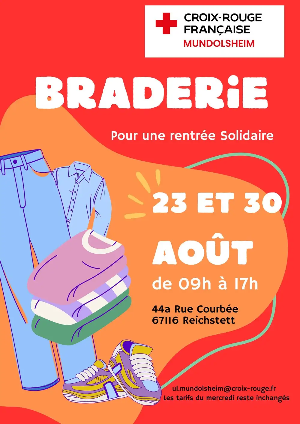 Les samedis 23 et 30 août de 9h à 17h, venez à notre Grande Braderie pour une Rentrée solidaire au 44a rue Courbée à Reichstett devant notre boutique. Nos bénévoles vous attendent avec le sourire !