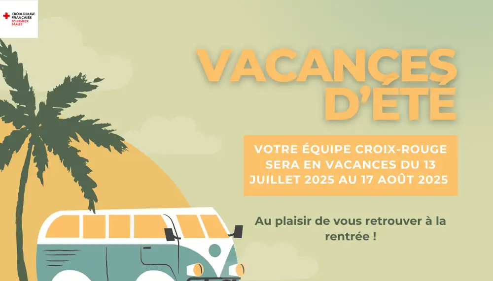 Nous vous informons que votre Croix-Rouge sera fermé du 13 juillet 2025 au 17 août 2025 inclus.