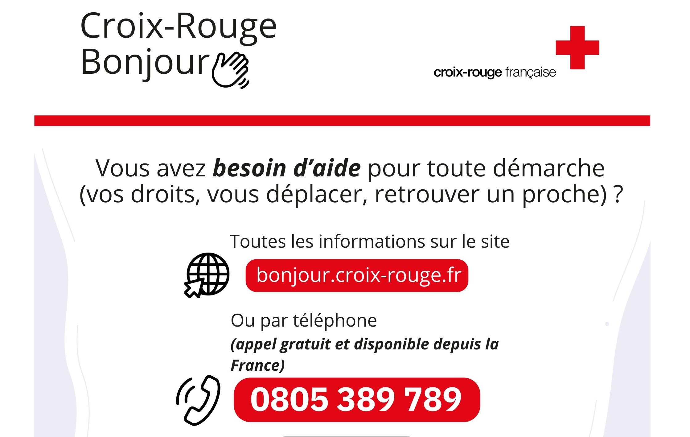 Croix-Rouge bonjour est complété par une plateforme téléphonique d'information et d’orientation francophone, ukrainophone, russophone et anglophone. Accessible au 0805 389 789 (appel gratuit et disponible depuis la France), elle est disponible 24h/24 et 7j/7 grâce à un Système Vocal Interactif (SVI) reprenant les mêmes entrées :