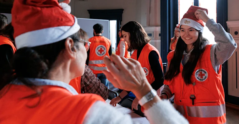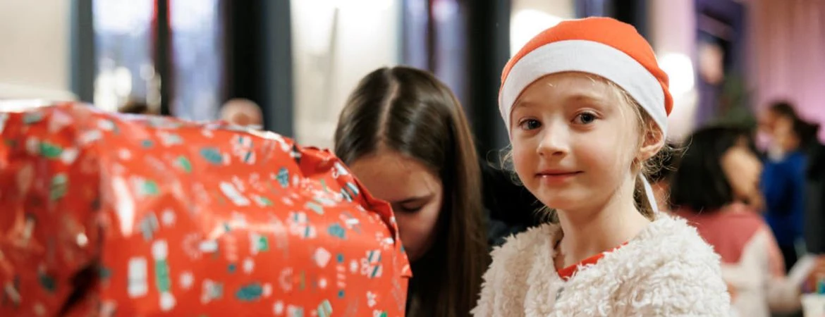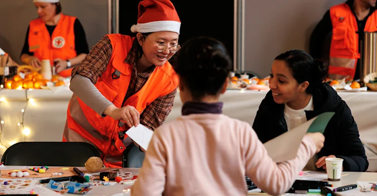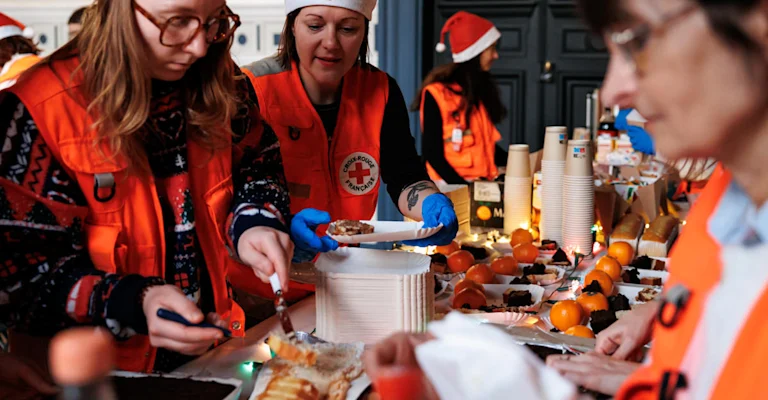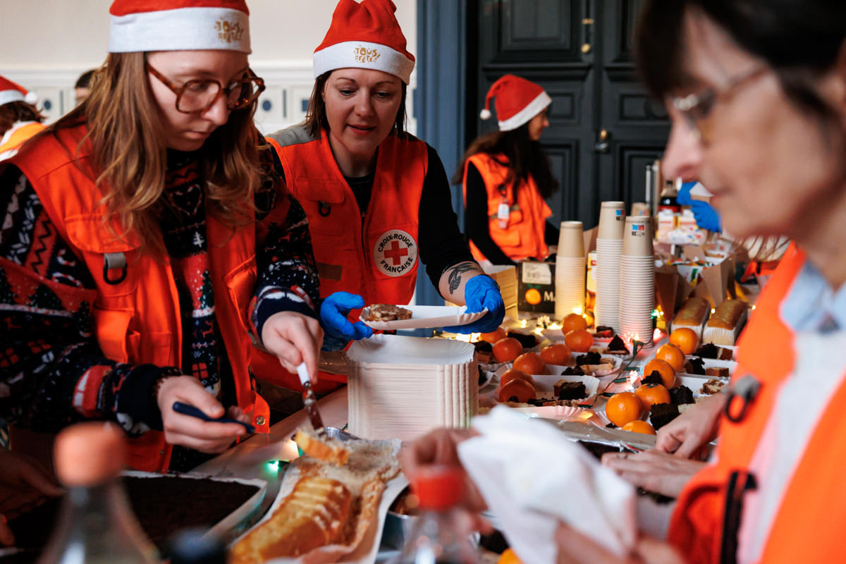 C'est l'effervescence à la salle des fêtes de la mairie du 3ème arrondissement parisien. Une trentaine de nos volontaires s'affairent pour que tout soit parfait avant d'accueillir plus de 100 convives. La majorité sont des enfants de moins de 10 ans, accompagnés de leurs frères et sœurs et de leurs parents. Tous vivent dans le centre de Paris. Certains sont invités par les services sociaux de la ville, d'autres viennent de nos structures à proximité : la vestiboutique, la laverie solidaire ou l'épicerie sociale. Beaucoup sont des familles monoparentales. « L'idée, c'est qu'ils se sentent au centre de l'attention au moins pour cette après-midi, sortir de chez eux, voir d'autres enfants et avoir des cadeaux neufs, ça on y tient beaucoup », précise Cristina, présidente de l'Unité locale du 4ème arrondissement. Tandis qu'on prépare les cornets de bonbons au buffet, on rassemble les tables de jeux et de coloriage à gauche pour faire place nette à la piste de danse à droite. Sur scène, on monte le volume des chansons de Noël. « Ah bah voilà c'est la fête ! », s'exclame une petite fille à sa maman en arrivant.